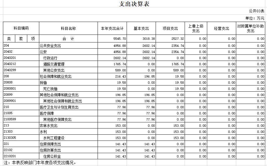 (5)一般公共服務(類)公安(款)其他公安支出(項)。主要反映用于辦公樓維修改造、停車場租賃費、檢驗鑒定費、警車燃修費、辦案、裝備等經費支出。年初預算為589萬元,支出決算為589萬元,完成年初預算的100%。決算數與年初預算數基本持平。主要原因是按年初預算執行。