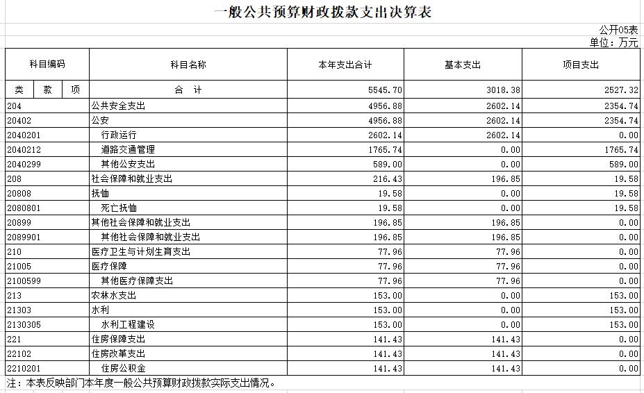 (1)一般公共服務(類)財政事務(款)行政運行(項)。主要反映用于交警行政運行支出。年初預算為2602.14萬元,支出決算為2602.14萬元,完成年初預算的100%。決算數與年初預算數基本持平。主要原因是按年初預算執行。