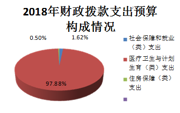 2018年一般公共預算支出預算為34598.1萬元,比上年預算數增長16.95%,主要原因是人員經費增加、基本公共衛生經費提高補助標準。其中:社會保障和就業(類)支出560萬元,占1.62%;醫療衛生與計劃生育(類)支出33866.1萬元,占97.88%;住房保障(類)支出172萬元,占0.5%。