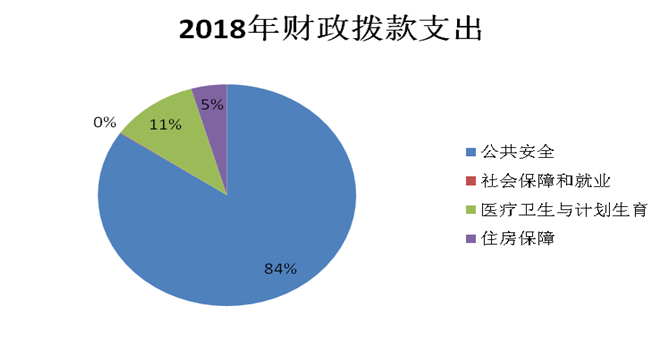 2018年財政撥款支出預算為14576.5萬元,比上年預算數增加1227.2萬元,主要原因是項目支出增加。其中:公共安全(類)支出12313萬元,占84.47%;社會保障和就業(類)支出14.9萬元,占0.1%;醫療衛生與計劃生育(類)支出1595萬元,占10.94%;住房保障(類)支出653.6萬元,占4.48%。