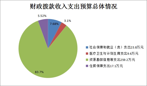 2018年財政撥款支出預算總計309.7萬元,比2017年預算數增加48萬元,主要原因是2018年預算中包括上年度精神文明獎及增加了外出考察和涉企政策匯編等費用。其中:社會保障和就業(類)支出23.8萬元,占7.68%,醫療衛生與計劃生育支出9.6萬元,占3.1%,資源勘探信息等支出259.2萬元,占83.7%,住房保障支出17.1萬元,占5.52%。