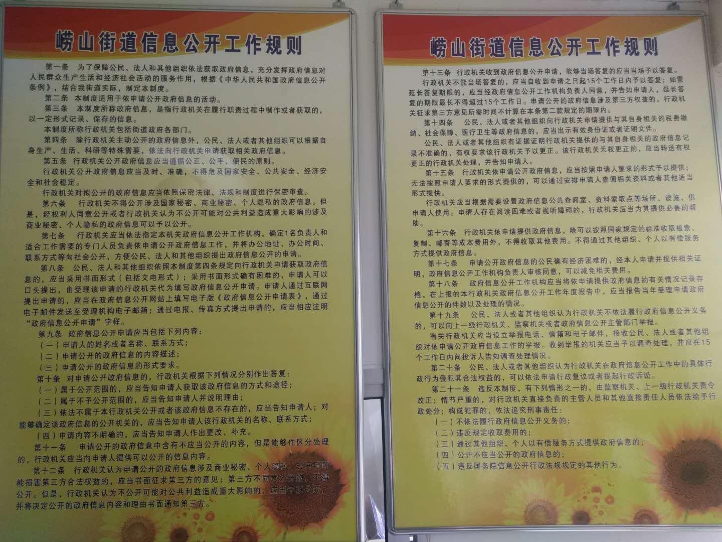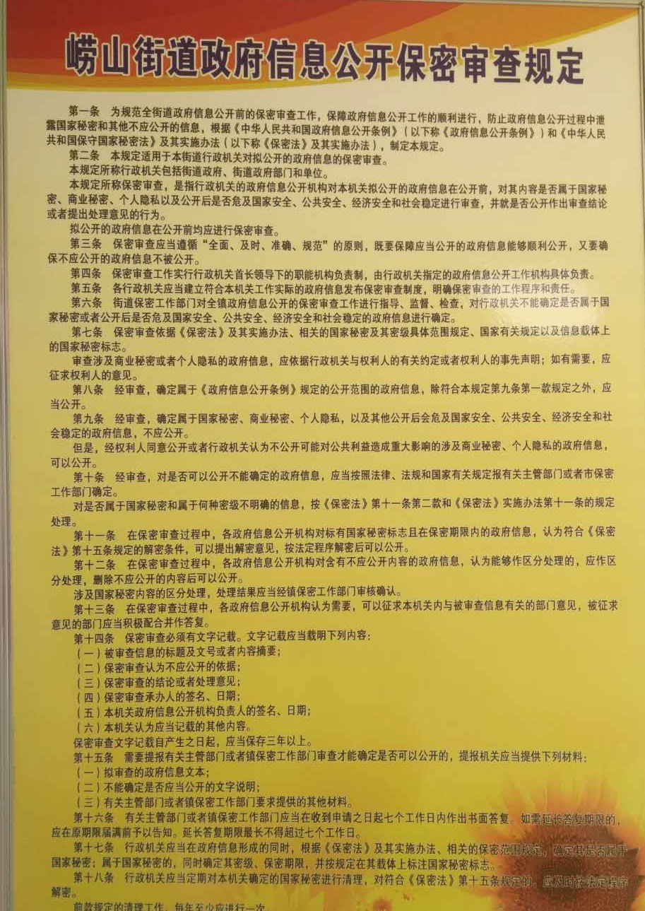 (二)進(jìn)一步完善了各種規(guī)章制度。擬定了年度政府信息公開(kāi)工作方案和年度工作計(jì)劃;根據(jù)工作開(kāi)展情況,進(jìn)一步修改完善了《榮成市嶗山街道政府信息公開(kāi)制度》、《榮成市嶗山街道政府信息發(fā)布審核制度》、《榮成市嶗山街道政府信息公開(kāi)社會(huì)評(píng)議制度》以及《榮成市嶗山街道信息公開(kāi)工作考核制度》、《榮成市嶗山街道政府信息公開(kāi)工作責(zé)任追究制度》等。