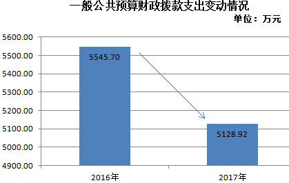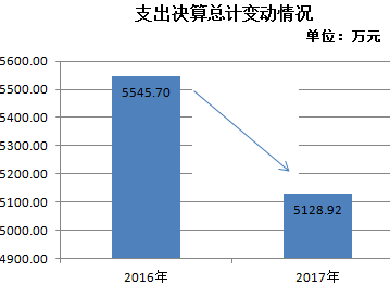 2017年度一般公共預(yù)算財(cái)政撥款支出5128.92萬元,占本年支出合計(jì)的100%。與2016年相比,一般公共預(yù)算財(cái)政撥款支出減少416.78萬元,減少7.52%。主要是2017年部分項(xiàng)目未完工、未驗(yàn)收,結(jié)轉(zhuǎn)2018年支付,因此2017年結(jié)算項(xiàng)目減少。