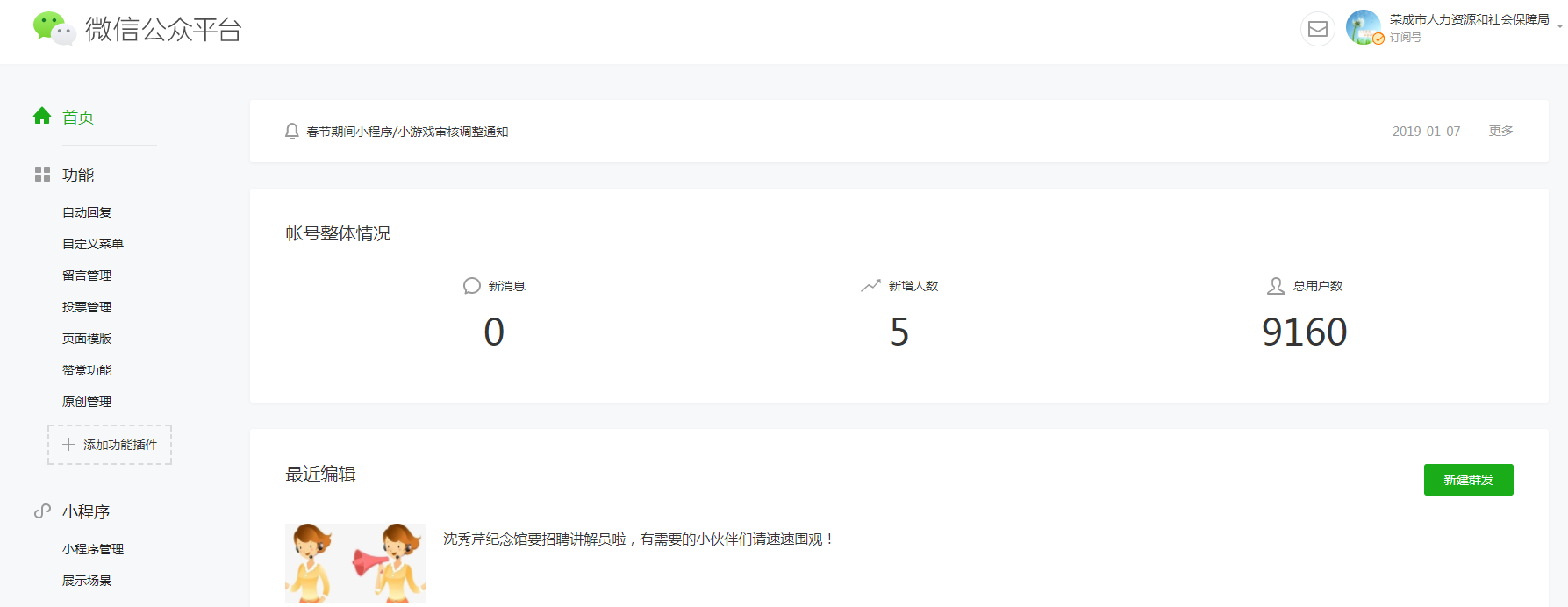 通過榮成市人力資源和社會保障局官方微信公眾平臺、官方微博、榮成民心網人力資源和社會保障局專欄、榮成就業創業網等及時發布最新政策信息解讀,并通過民心網、市長信箱等與群眾互動交流,答疑解難。