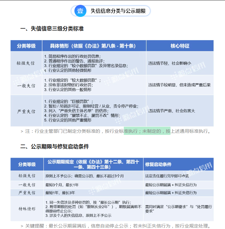 第十二條 輕微失信信息原則上不予公示;行業(yè)主管部門認(rèn)為確有必要公示的,公示期最長(zhǎng)不超過(guò)3個(gè)月,且法定責(zé)任履行完畢即可申請(qǐng)修復(fù)。一般失信信息的最短公示期為3個(gè)月,最長(zhǎng)為1年。嚴(yán)重失信信息的最短公示期為1年,最長(zhǎng)為3年。