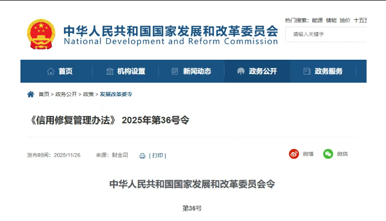近日,國(guó)家發(fā)改委印發(fā)《信用修復(fù)管理辦法》,《辦法》經(jīng)2025年11月19日第25次委務(wù)會(huì)議審議通過(guò),自2026年4月1日起施行。