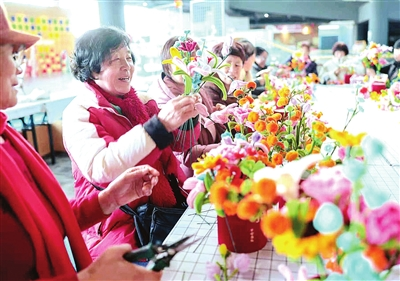 巧手翻飛,收獲美好。日前,在港灣街道大魚島社區,志愿者陪老人制作手工插花。